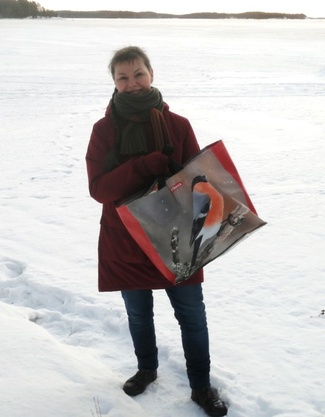 ![]() Tiina Pulkkinen Pihlajaveden rannalla, josta kesäisin rantautuu paljon mm.muoviroskaa, jotka hän säännöllisesti korjaa roskasäiliöihin. |