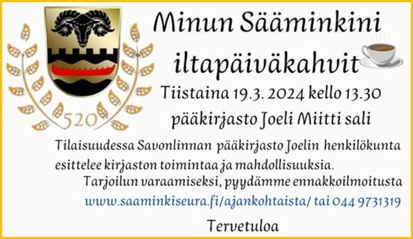 Seuraava Minun Sääminkini iltapäiväkahvitilaisuus on maanantaina 18.3. klo 13.30.
