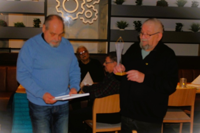 ![]() Puheenjohtaja Jukka Nokelainen ojentaa JUURET SÄÄMINGISÄ-kunniakirjan sekä pöytäviirin Vesa Luukkoselle. Kuva: Jorma Vauhkonen |