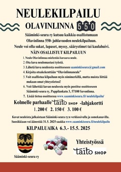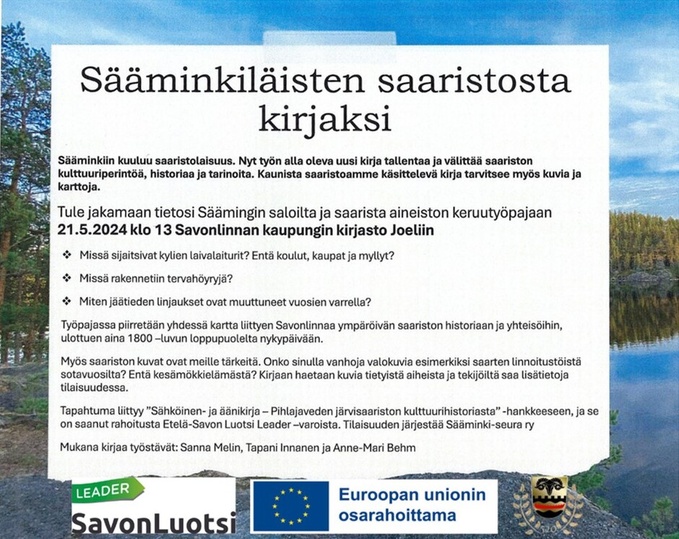 Säämingin perustamisesta tulee kuluneeksi tänä vuonna 520 vuotta. Tämän tiimoilta päätimme järjestää Joelissa lauantaina 21.9. 2024 kello 10-15 Sääminkipäivän, jossa esillä sääminkiläisiä kirjailijoita ja heidän teoksiaan sekä Säämingin historiaa ja Sääminki-seura ry:n toimintaa.