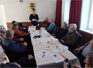 ![]() Minun Sääminkini iltapäiväkahvitilaisuuden osallistujia. Tilaisuuden alustaja Ilmari Kosonen kuvassa vasemmalla |