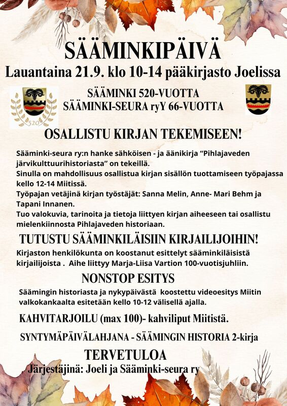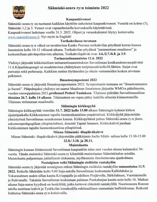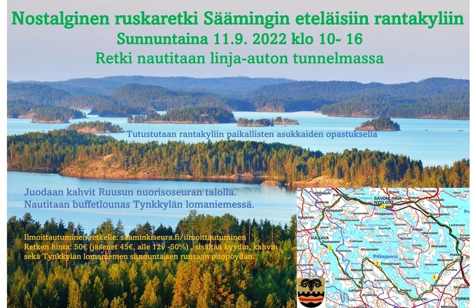 Sääminki-seura ry järjestää nostalgisen retken Säämingin eteläisiin rantakyliin sunnuntaina 11.9. 2022. Retkelle lähdetään kello 9.00 linja-autoasemalta, Savonlinnan keskustasta Kallislahden ja Vekarasalmen uuden sillan kautta Kiviapajalle ja edelleen Piojärvelle, Särkilahteen, Vuoriniemelle ja Ruhvanalle. Takaisin Savonlinnan keskustaan palataan Punkaharjun kautta noin kello 16. Matkan aikana linja-auton kyydissä on henkilöitä, jotka kertovat elämästä rantakylillä. Nuorisoseura Ruusun talolla nautitaan kahvit ja Tynkkylän lomakodilla ruhtinaallinen sunnuntain buffettilounas. Retken hinta 50 € (jäsenet 45 €, alle 12-vuotiaat lapset -50%.