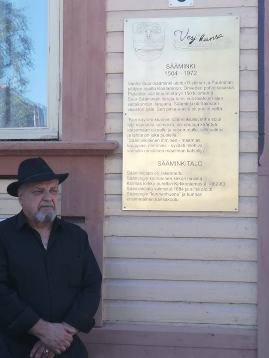 Kuvassa Sääminkiseuran hallituksen jäsen, kirjailija Vesa Luukkonen, joka on laatinut tekstin muistolaattaan toisen kirjailijan Joel Lehtosen ( sitaattien sisässä) kanssa.