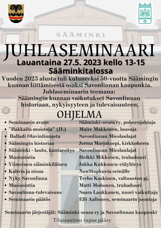 1) Vuoden 2023 alusta tulee kuluneeksi 50-vuotta Säämingin kunnan liittämisestä Savonlinnan kaupunkiin.