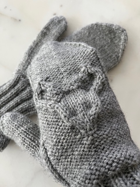 Ota langalla olevat 6 + 6 silmukkaa omille puikoille. Poimi molemmista reunoista 3 + 3 silmukkaa, yhteensä peukalon silmukoita on 18s. Neulo 16 krs à aloita kärkikavennus yliveto kavennuksena. Kun joka puikolla on 2 s jäljellä, katkaise lanka ja vedä se silmukoiden läpi.