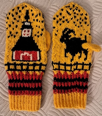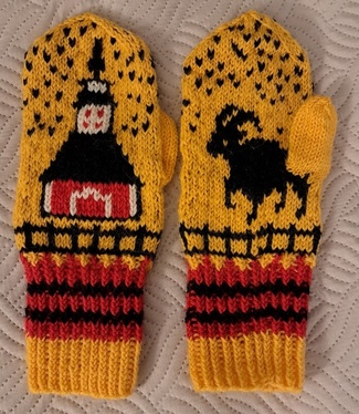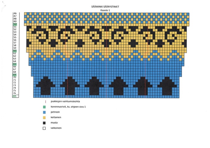 Viimeinen aidan kuviokerros taas 1 musta, 3 kelt ja toista näin kerros loppuun. Älä katkaise mustaa ja keltaista lankaa. Työ jatkuu niillä kirjoneuleena kärkikavennuksiin asti.