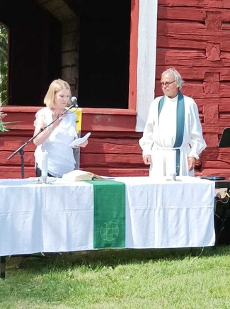 ![]() Emeritus kirkkoherra Jorma Marjokorpi esitti laatimansa Säämingin historian. | ![]() Juhlajumalanpalveluksessa saarnasi kirkkoherra Sammeli Juntunen. Sääminkiseuran jäsen Elli Aaltonen luki päivän tekstiä. |