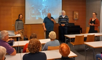 ![]() Sähköisen - ja äänikirjan kirjoittajat Sanna Melin(vas), Tapani Innanen ja Anne- Mari Behm aloittelemassa työpajaa. Sääminki-seura ry;n puheenjohtaja Jukka Nokelainen esittelee heidät työpajaan osallistuville henkilöille. Kuva: Jori Vauhkonen | ![]() Heikki Mikkonen on tuonut työpajaan valokuvia kirjaan, joita kirjoittajat Sanna Melin ja Tapani Innanen tutkivat innostuneena. kuva: Jori Vauhkonen |