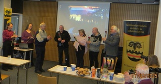 ![]() Kirjan tekijät varapuheenjohtaja Pekka Turtiaisen kukitettavana. Sanna Melin (vas.), Anne-Mari Behm, Jukka Nokelainen ja Salme Kivijärvi ( äänikirjan lukijat), Timo Tahvanainen ( Kirjan taittaja ja äänittäjä) sekä Tapani Innanen. Kuva: Jori Vauhkonen |